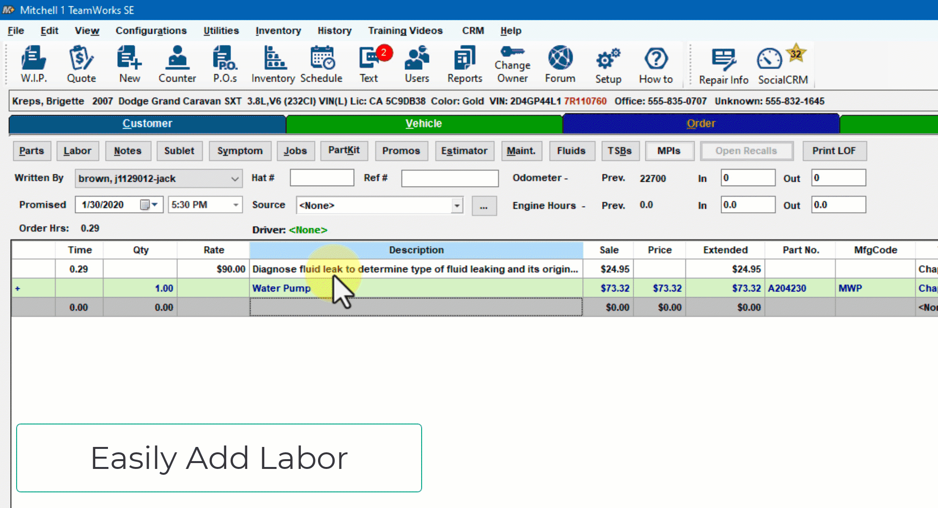 Easily create a quote by transferring the labor to the work order and then the parts. Increase profits when you eliminate typos and save time when the labor description is added to your invoice automatically.