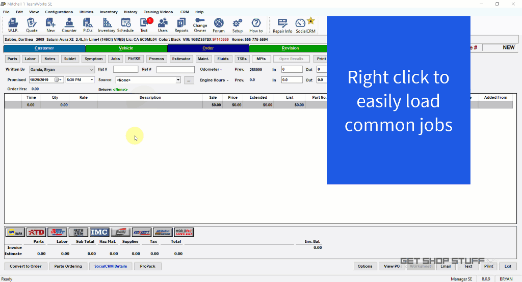 Shops often sell the same or similar jobs daily. Using our canned job function will allow you to quickly prepare an estimate/invoice for your customer giving you back valuable time. Brake jobs, F/I service, transmission service, alignments and more!